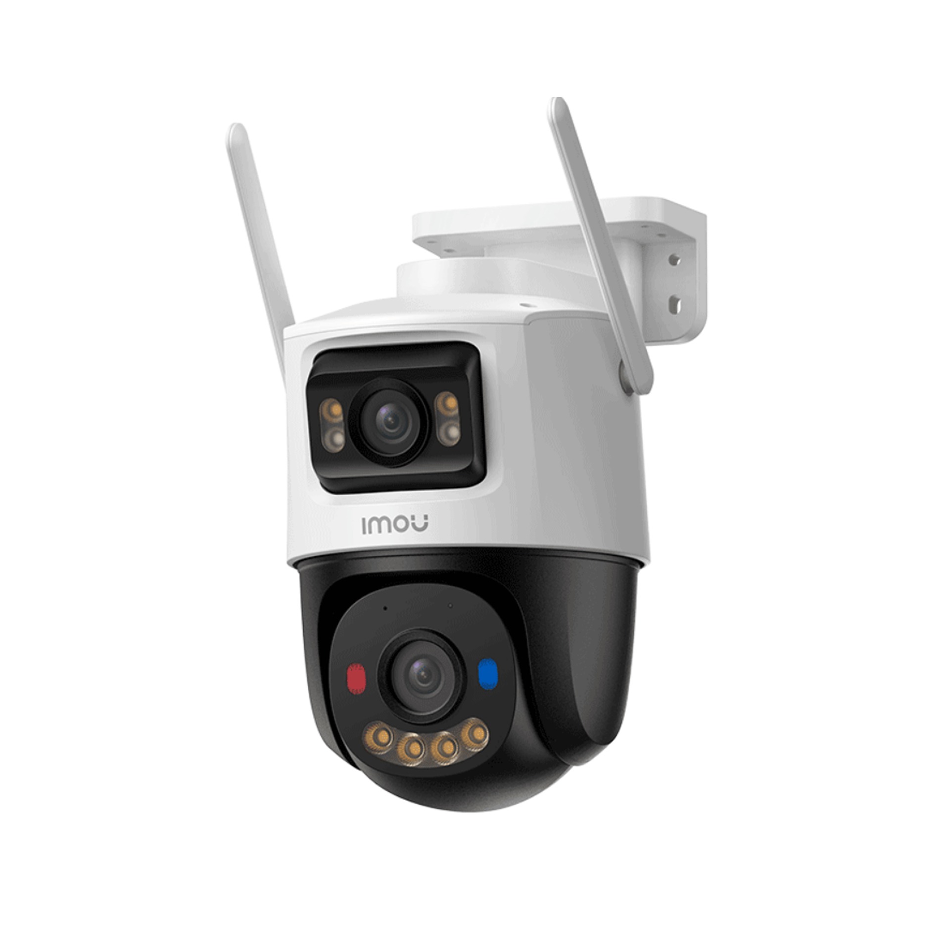 La IMOU Cruiser Dual 2 Pro combina dos lentes (una fija de 4 MP y otra PT de 4 MP) para ofrecer un video de 8 MP que cubre ángulos amplios con gran detalle. Posee visión nocturna en color hasta 30 m, luces blancas y LED de alerta rojo-azul para disuasión activa.