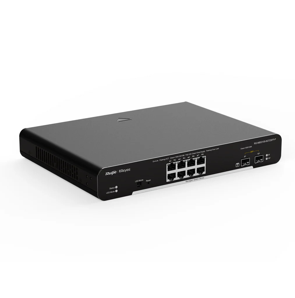 El RG-NBS3100-8GT2SFP es un switch de Capa 2 (L2) totalmente gestionable, diseñado para proporcionar un rendimiento de alto nivel en redes empresariales y comerciales. Equipado con 8 puertos Gigabit Ethernet y 2 puertos SFP dedicados para fibra óptica, este equipo permite crear redes troncales sólidas y rápidas. Su diseño robusto y su capacidad de gestión avanzada a través de la nube lo convierten en la pieza ideal para oficinas, centros de datos pequeños y sistemas de videovigilancia que utilizan fuentes de poder independientes, garantizando siempre una transferencia de datos fluida y segura.